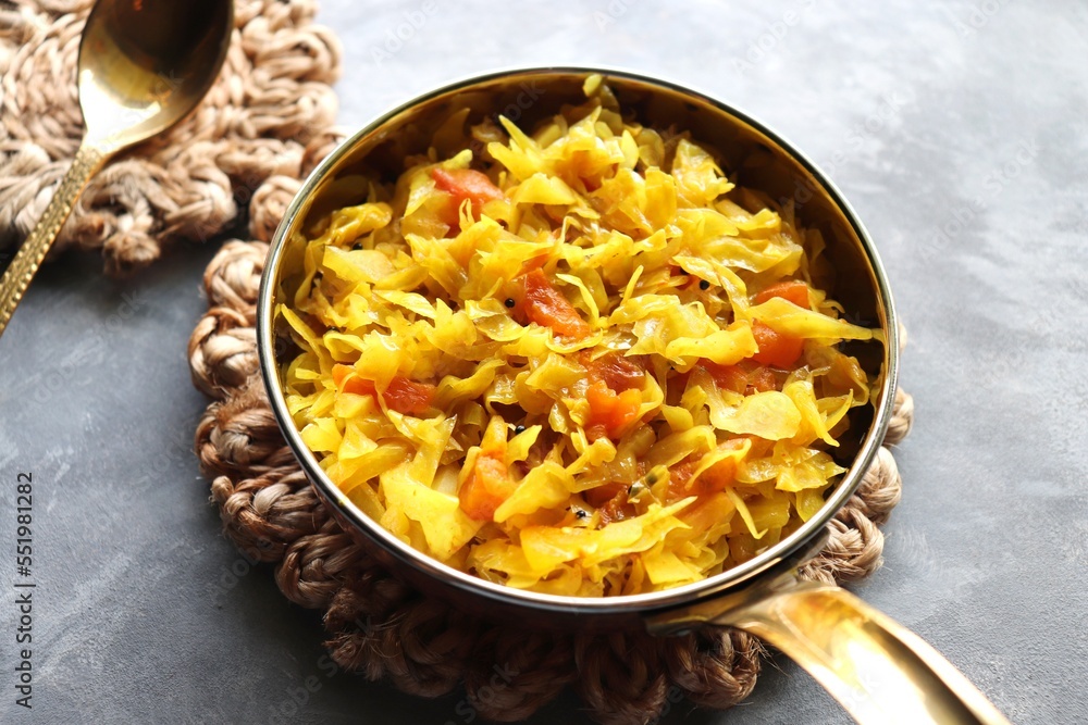 Stir fried Cabbage Salad or patta gobi ki sabzi. served in a bowl over moody background, Copy space.