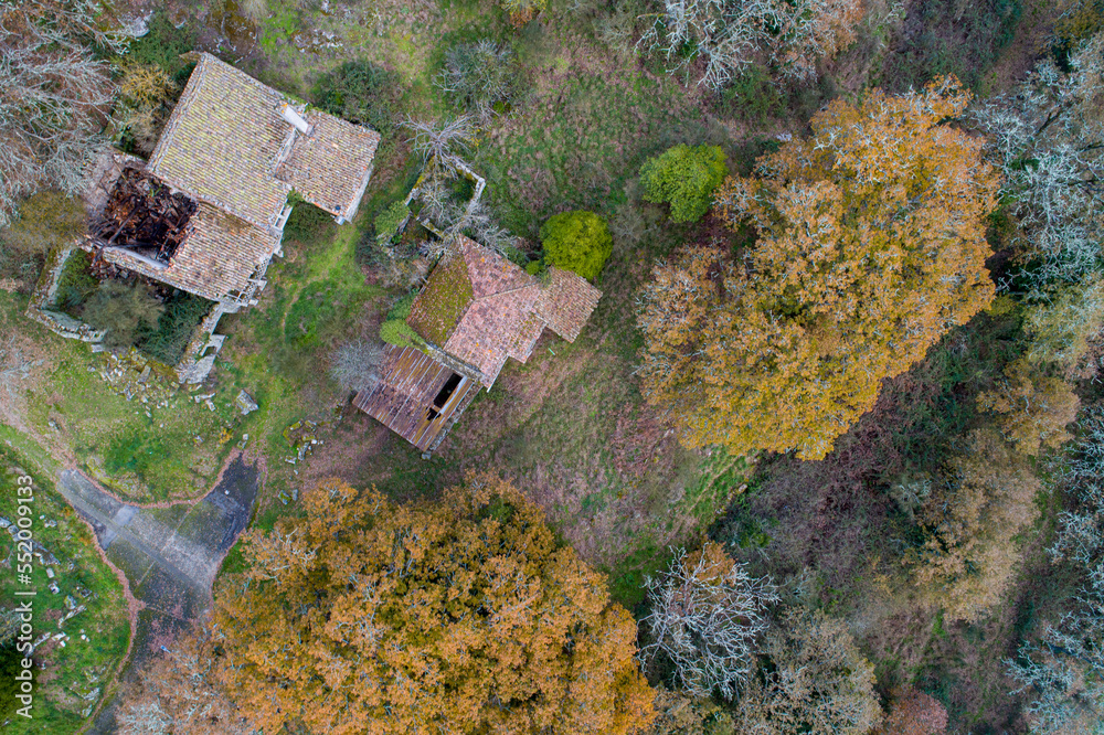 area view of some ruined houses in an oak forest