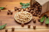 Macadamia nut in wooden plate on wooden background, Roasted Macadamia nuts on wooden background.