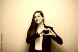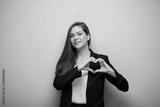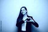 Smiling business woman in black suit holding heart figure with fingers, isolated portrait.