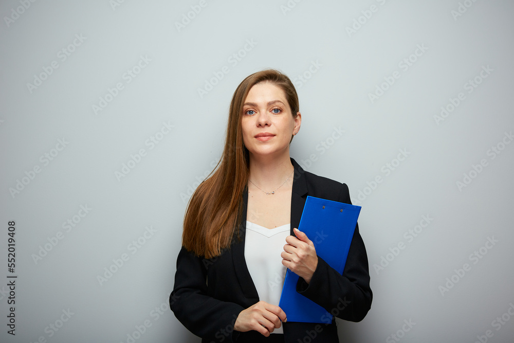 Serious woman teacher holding book. Isolated portrait with copy space.