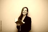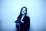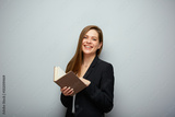 Smiling woman teacher reading book. Isolated portrait with copy space.