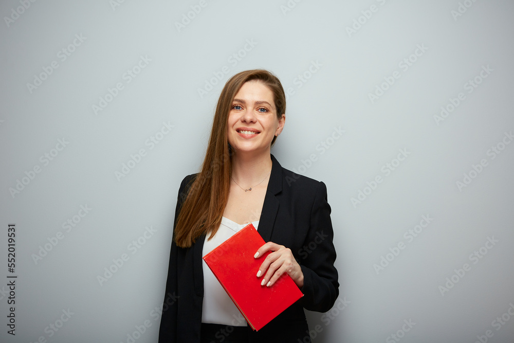 Smiling woman teacher holding red book. Isolated portrait with copy space.