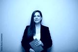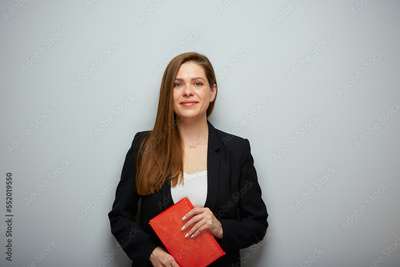 Smiling woman teacher holding red book. Isolated portrait with copy space.