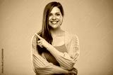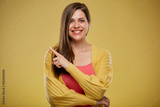 Smiling woman in yellow casual clothes pointing finger at side. Advertising female studio portrait.