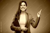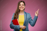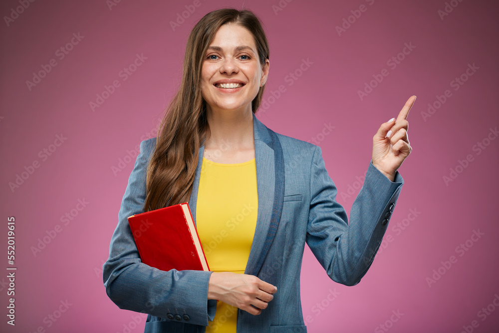 Smiling school teacher holding book and pointing finger. Isolated advertising portrait.