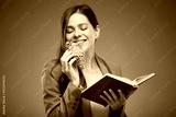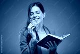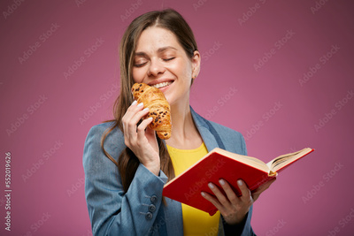 Breakfast or lunch with beautiful teacher woman with croissant. Isolated advertising portrait.