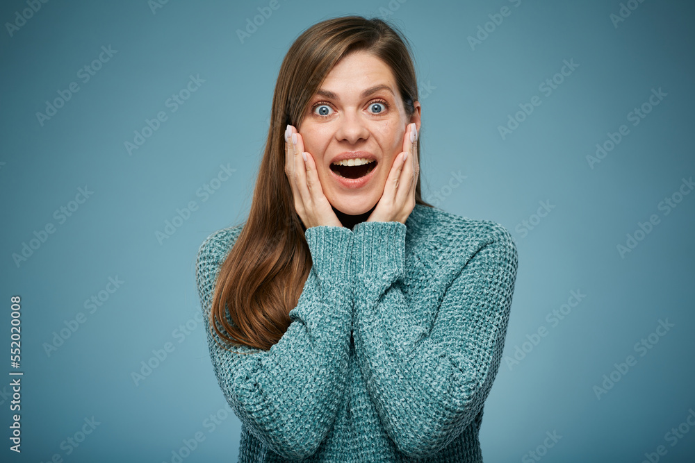 Excited surprising young woman in blue warm clothes holding hand on face. isolated studio portrait.