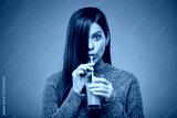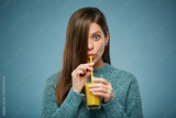 Smiling woman holding orange juice. Isolated female advertising portrait.