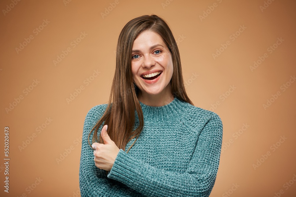 Smiling young woman showing thumb up. Isolated advertising portrait.