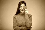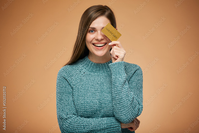 Smiling woman holding credit card in fron of eye. Advertising female studio portrait.