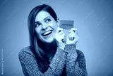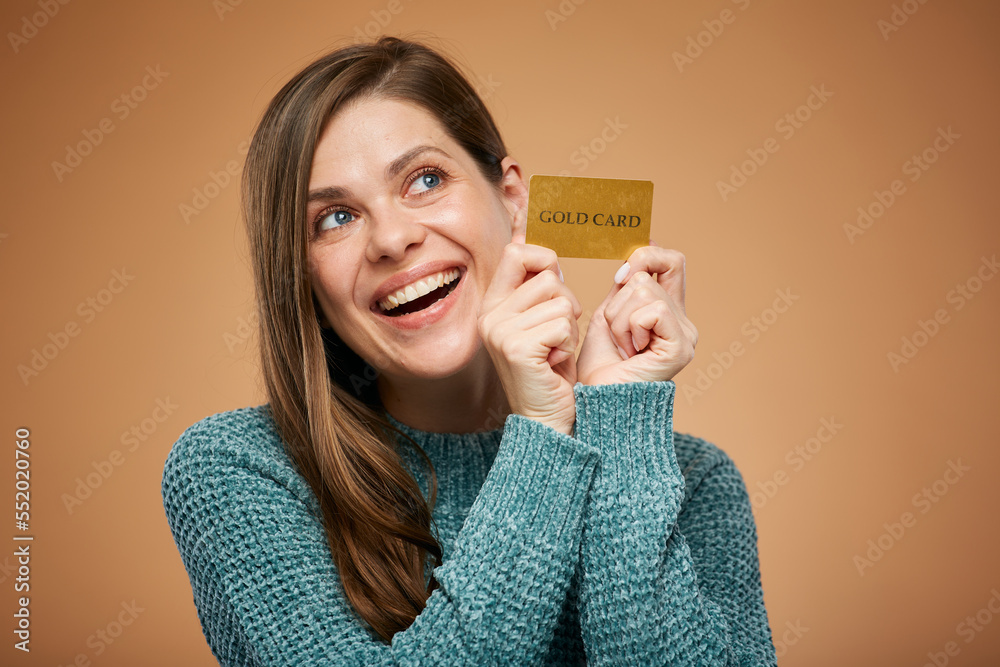 Young woman holding golden credit card and looking up. Advertising female studio portrait.