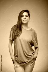 Smiling woman in brown casual home shirt holding hands in pockets. Isolated female portrait. Girl with long hair