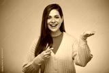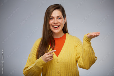 Smiling young woman in yellow holding empty hand, pointing finger. Isolated advertising portrait.