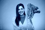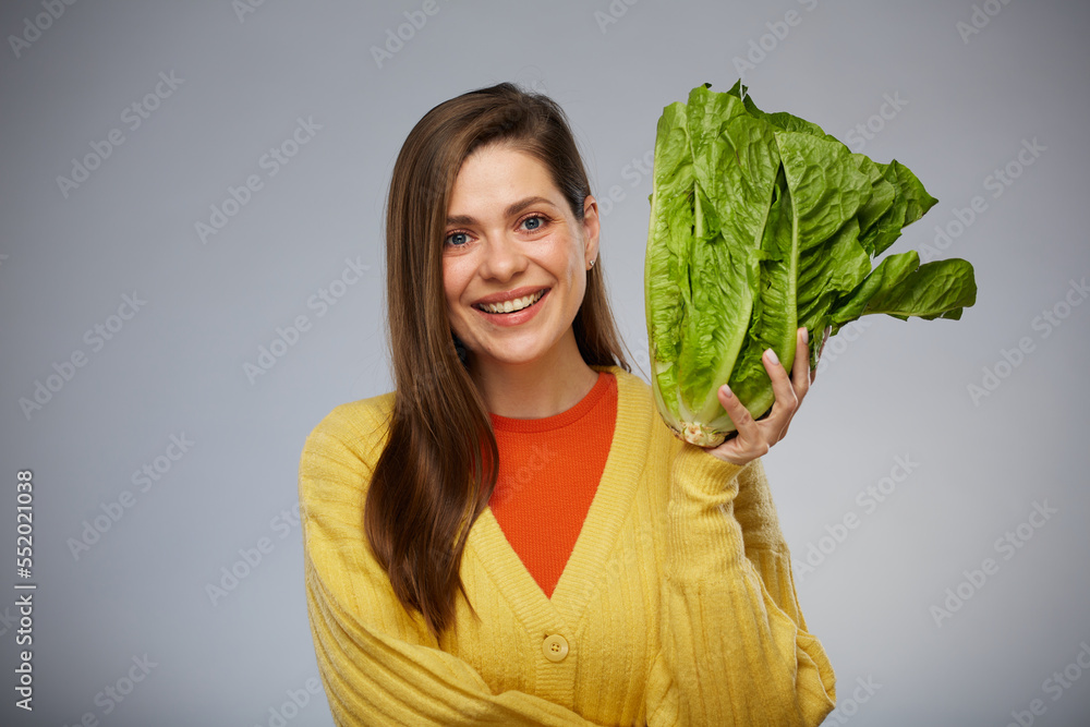 Smiling woman holding green lettuce. Advertising female studio portrait.