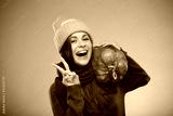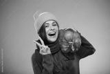 Happy smiling woman in winter clothes holding pouch with oranges on her shoulder and showing two finger. Christmas style portrait. Advertising female studio portrait.