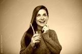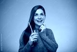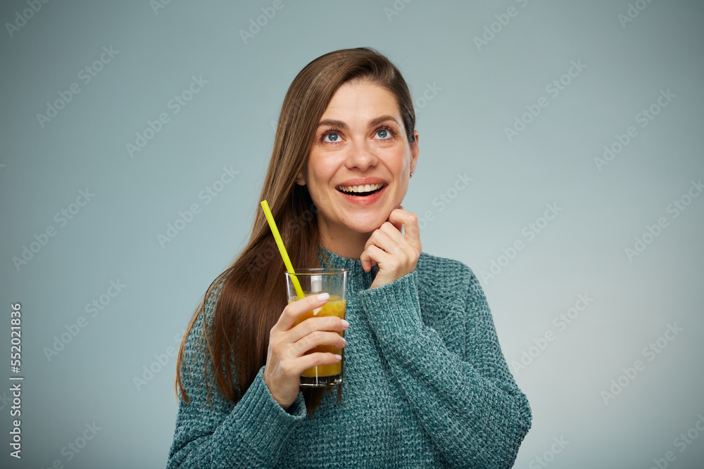 Smiling young woman holding orange juice and looking up. Advertising female studio portrait.