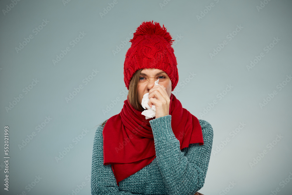Woman wearing warm clothes with symptoms of allergies or colds. Advertising female studio portrait.