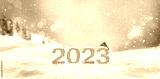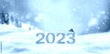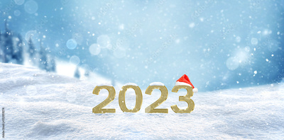 New Year background with golden numbers 2023 and Santa hat on beautiful new year snowy background