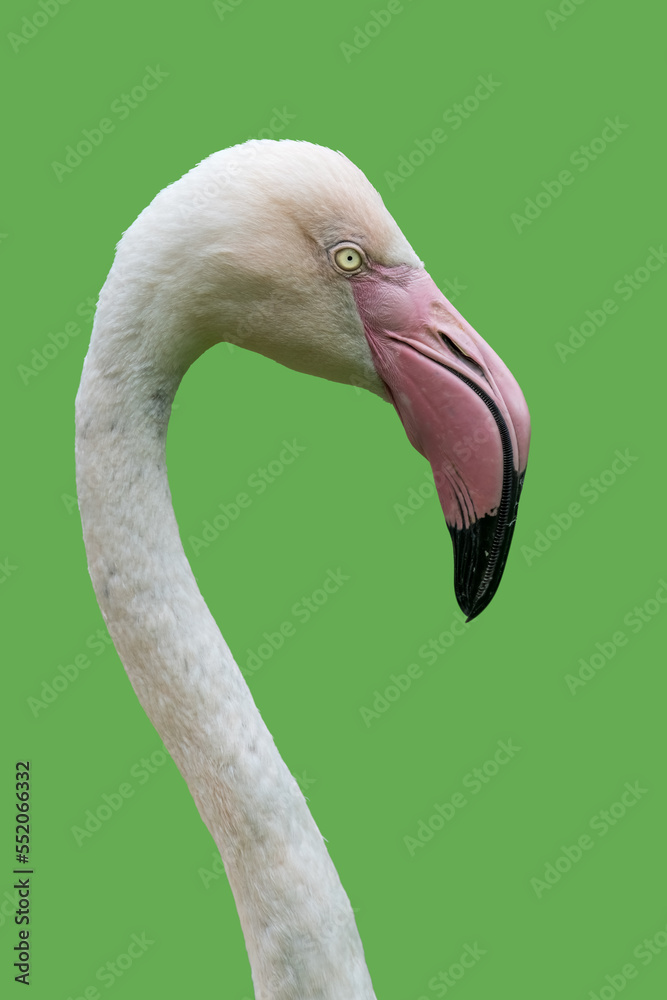 white flamingo portrait on solid green background