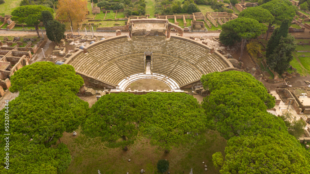 Aerial view on the Roman theatre of Ostia Antica, a large archaeological site, close to the modern town of Ostia. The ancient Roman Amphitheater is located in Rome, Italy.