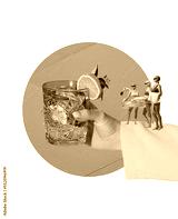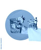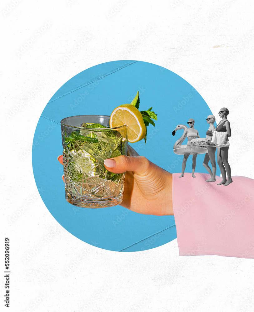Summer beach party. Contemporary art collage. Female hand with mojito cocktail over light background with blue circle shape. Party, fun, surrealism, drinks and cocktails