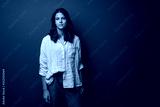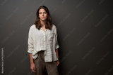 Lovely casual teen girl wearing natural linen shirt standing on dark background