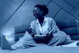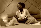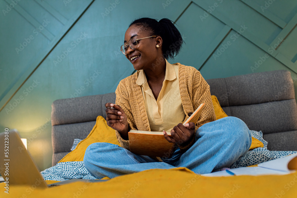 Young African American woman sitting in bed in the bedroom studying using laptop.
