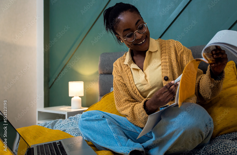 Young African American woman sitting in bed in the bedroom studying using laptop.