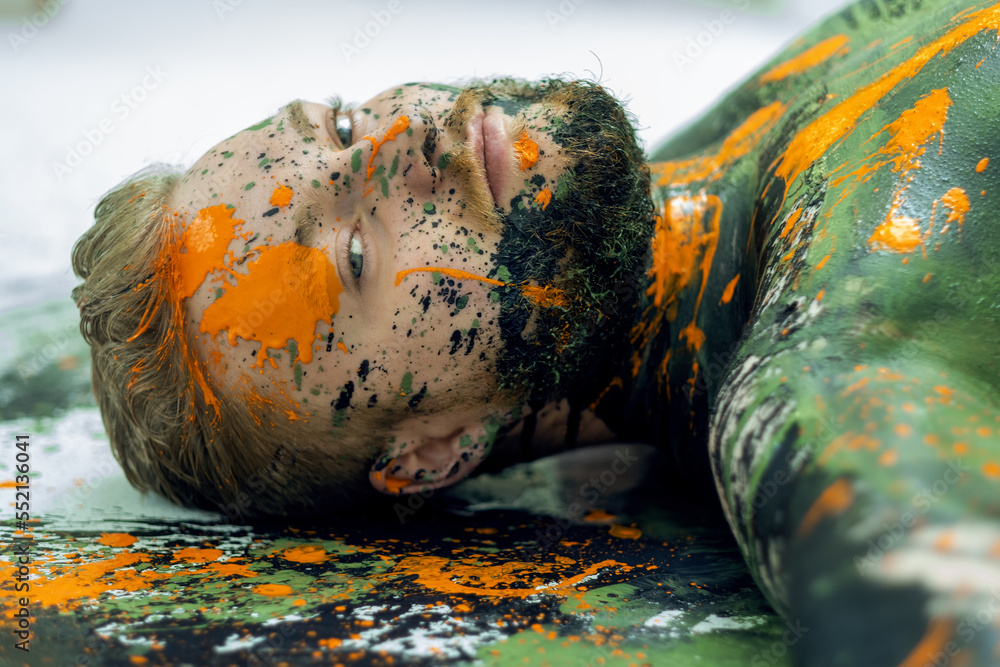 portrait of young sexy naked man, bodybuilder in olive green, black, orange, camouflage color painted, decorative