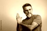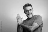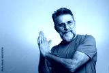 Mature handsome charming man showing something with index finger, place for text, advert, copy space. isolated on blue background. direction. body language. sale, shop