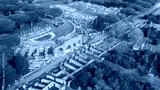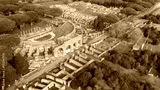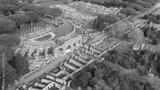 Aerial view on the Roman theatre of Ostia Antica, a large archaeological site, close to the modern town of Ostia. The ancient Roman Amphitheater is located in Rome, Italy.