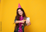 pretty woman in a pink party hat and pink boa holds a glass of champagne in her hands, smiles and holds a smartphone in her hands