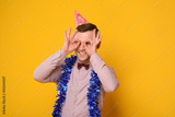 man in a party cap makes glasses out of his hands and smiles on a yellow background