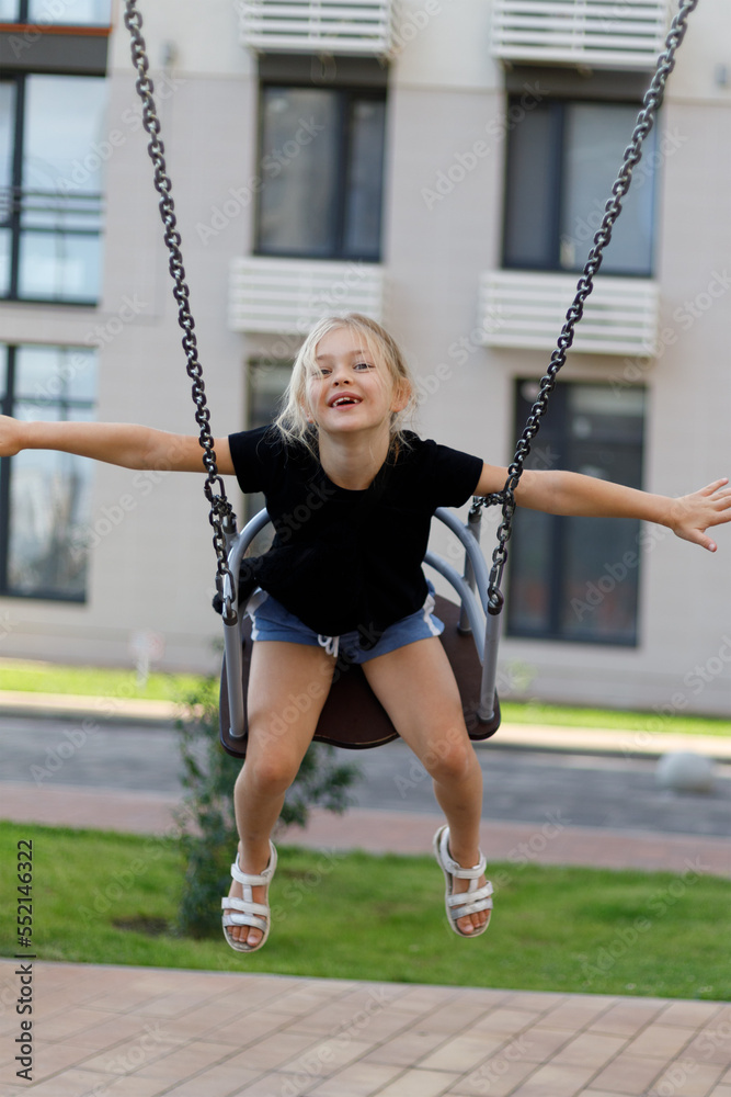 Carefree and happy little girl rides on a swing in the playground.