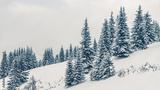 Beautiful snowy fir trees in frozen mountains landscape. Christmas background with tall spruce trees covered with snow in forest. Alpine ski resort. Winter greeting card. Happy New Year