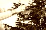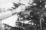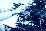 Woman hand holding a red ornament putting it on the Christmas tree