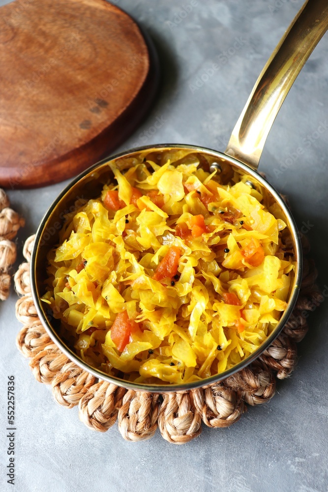 Stir fried Cabbage Salad or patta gobi ki sabzi. served in a bowl over moody background, Copy space.