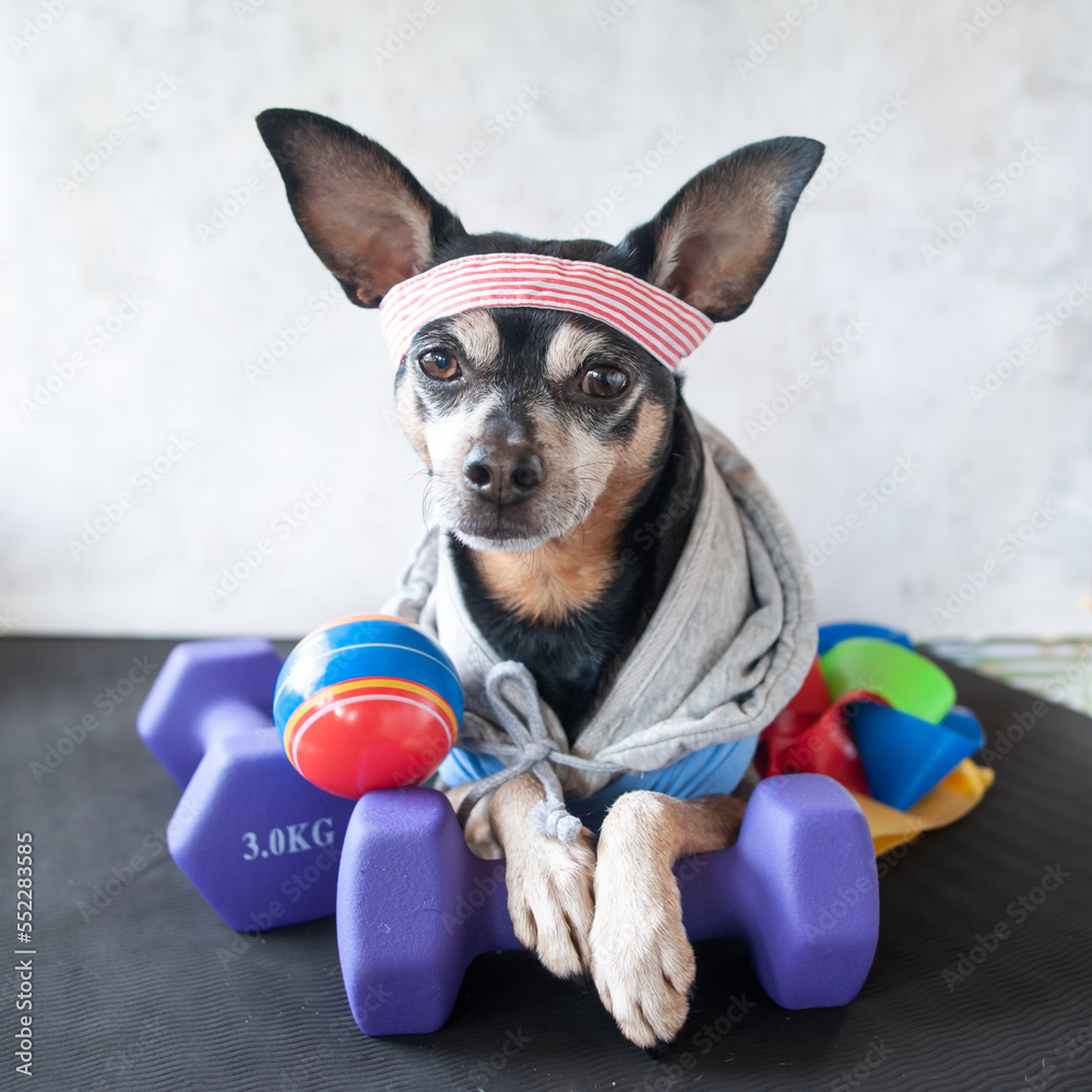 Dog fitness. Fitness and healthy lifestyle for pet. Dog trainer portrait in studio surrounded by sports equipment
