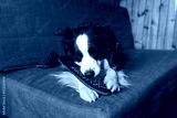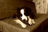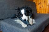 Naughty playful puppy dog border collie after mischief biting slipper lying on couch at home. Guilty dog and destroyed living room. Damage messy home and puppy with funny guilty look