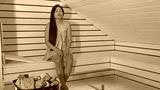 Beautiful Filipina at spa treatment in wooden Finnish sauna wearing pink towel
