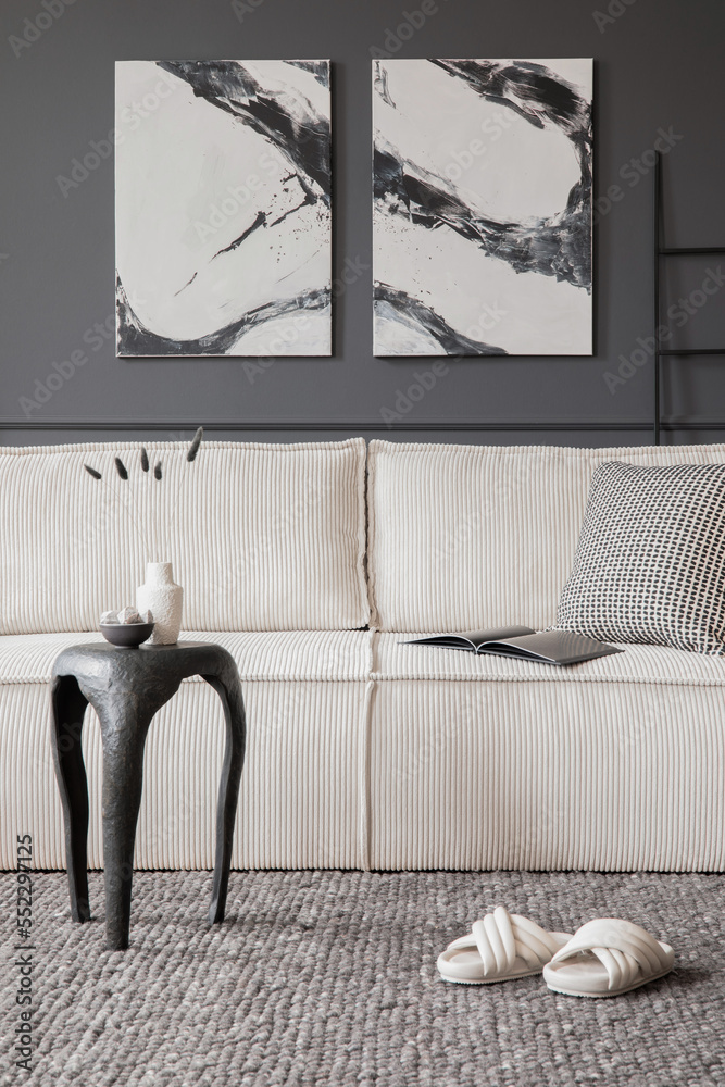 Interior design of living room interior with mock up poster frame, modular sofa, pillows, modern coffee table, vase with dried flowers, rug, slippers and personal accessories. Home decor. Template.