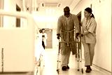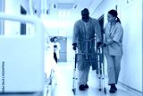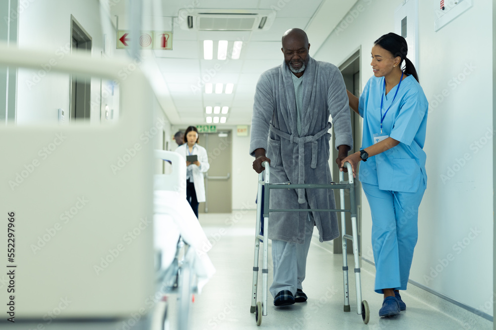 Diverse female healthcare worker helping senior african american male patient use in hospital