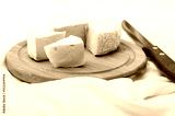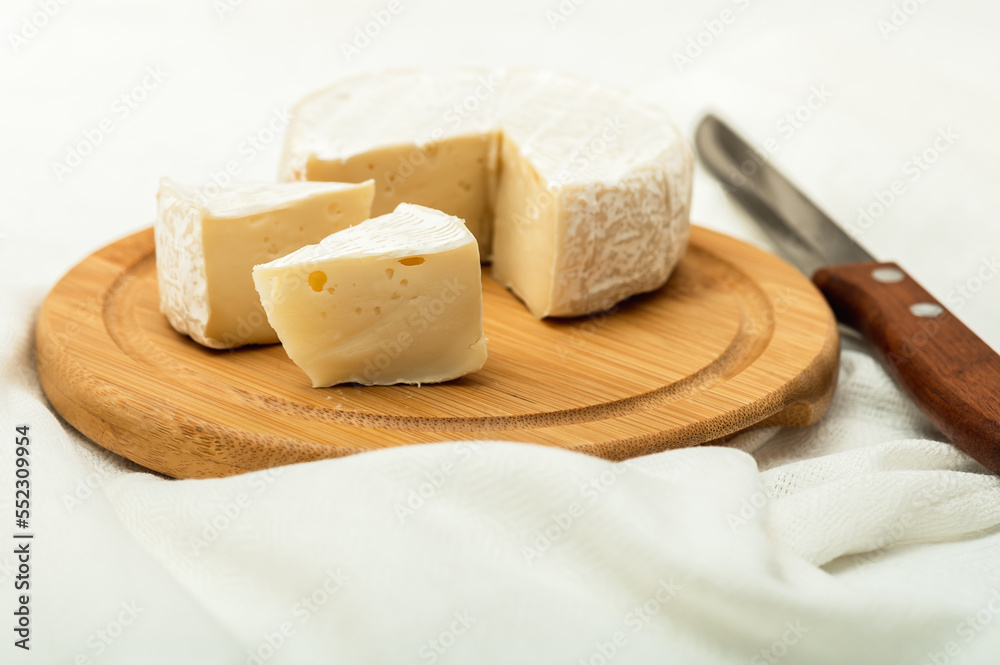 Sliced head of fresh soft cheese on a round wooden board. Selective focus.