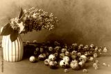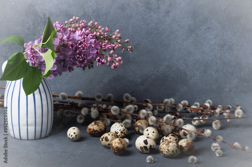Lilac branch in a vase. Quail eggs and willow. Easter composition. Selective focus.