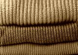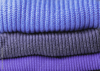 A stack of knitted wool sweaters in lilac-lavender colors. Warmth and comfort. Winter clothes.