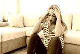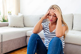 Tired, depressed and sad woman thinking of divorce, depression and anxiety stress with mental health problem on sofa in home. Caucasian girl with burnout, trauma from abuse and frustrated with mistake