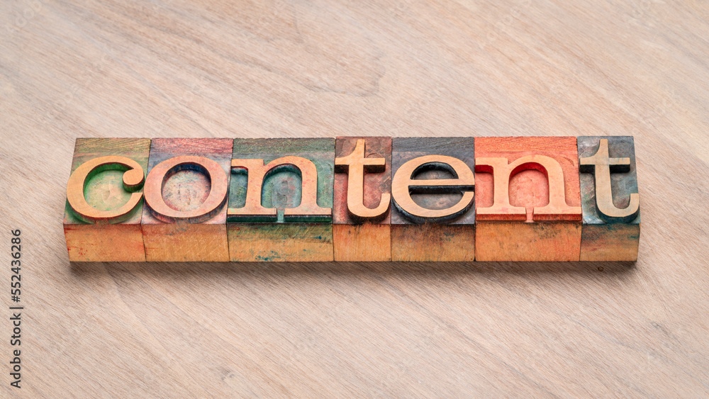 content - word abstract in vintage letterpress wood type printing blocks against grained wooden background, media and communication concept