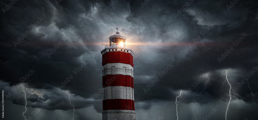 View on typhoon, hurricane, tornado, lighthouse and rain sky. Panoramic view of the stormy sky, lighthouse and dark clouds. Concept on the theme of weather, natural disasters, tornadoes, typhoons.