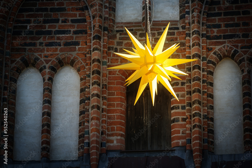 Yellow Moravian star hanging in front of an historic building in Luebeck, Germany, traditional street decoration for Advent, Christmas, and Epiphany, copy space